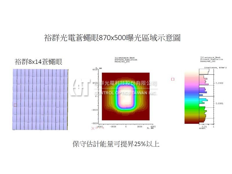 當產品尺寸變更時,有些設備無法配合產品尺寸進行曝光區域變更,因此損失部分能量於無效區,本公司可依需求尺寸將光學鏡片重新設計,使其曝光區域與產品尺寸相互搭配,減少能量損失,提昇產速產能。